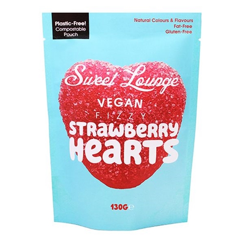 Sweet Lounge Vegan Fizzy Strawberry Hearts Pouch 130g [Pack of 8]